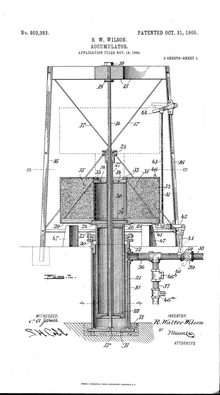 “My invention relates to apparatus for storing energy and regulating its application, it being particularly adapted for use in connection with such motors of irregular speed such as windmills which are applied to the pumping of water. Its principle objects are to provide automatic means for controlling the reception and delivery of energy by the accumulator and to generally improve the construction of apparatus of this class.” – from the October 31, 1905 patent description for the accumulator.