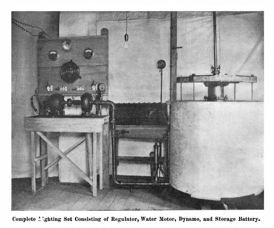 image of regulator, water motor, dynamo, and storage battery from the Scientific American